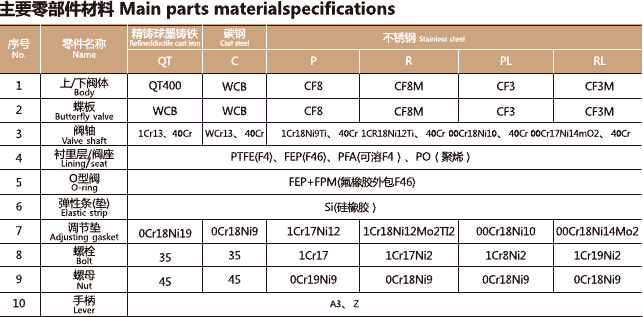 防腐蝕襯氟蝶閥,襯四氟蝶閥,全襯里蝶閥采用對分兩片閥體組合,閥座與閥體內(nèi)襯一體化,閥門工作時,只有全塑閥座與襯塑蝶板與介質(zhì)接觸,產(chǎn)品可承受“除熔融堿金屬和元素氟”外的任何介質(zhì)腐蝕,其中D71F46閥桿與蝶板(鍛)為一體,表面均勻包覆一層FEP。閥體通道內(nèi)表面光滑,流體阻力小,CV值高,流通能力好,扭矩適中,采用四ji密封結(jié)構(gòu)并在密封面外配以耐溫抗老化的SI橡膠的彈性襯墊閥座,完全達到介質(zhì)的零泄漏。