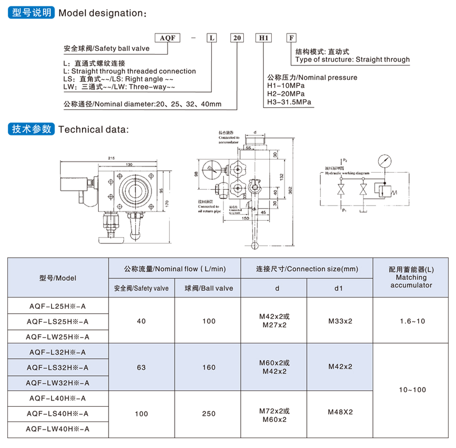 AQF安全球閥,AQF型安全球閥主要用于液壓一囊式蓄能器作為安全,斷流和卸荷的蓄能器附件。安全閥可保持系統(tǒng)中的壓力調(diào)定值。當(dāng)壓力調(diào)定值時,安全閥開啟,防止系統(tǒng)過載,特別是封閉系統(tǒng)中的蓄能器更不可缺少,而防止外負(fù)荷的突然加大所造成系統(tǒng)的危害。特點:結(jié)構(gòu)緊湊、體積小,安全方便,操作簡單。