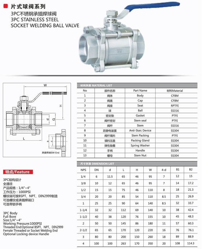 適用介質:水、油、氣及某些腐蝕性液體(W.O.G) 三片式承插焊球閥適用穩(wěn)定溫度范圍:-20~232℃~350℃三片式承插焊球閥公稱壓力:1.6-6.4MPa