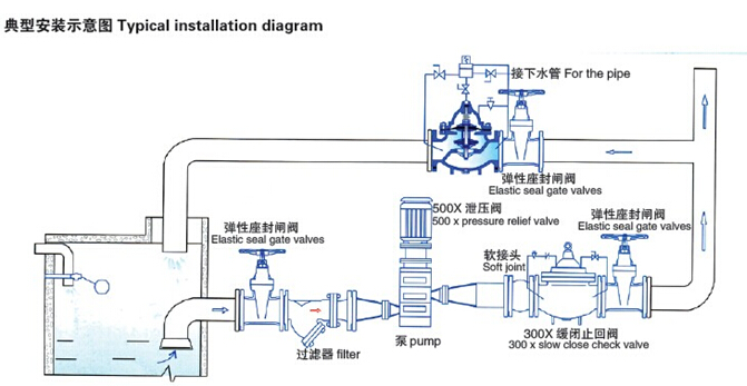 由主閥、泄壓/持壓導(dǎo)閥針閥、球閥、微形過濾器和壓力表組成水力控制接管系統(tǒng)。利用水力自動操作,即可以作泄壓閥用又可作持壓閥用。作泄壓閥用時,可維持供水路壓力在設(shè)定的安全值之下;做持壓閥用,可維持主閥上游水壓在設(shè)定值之上,保持主閥上游供水壓力。