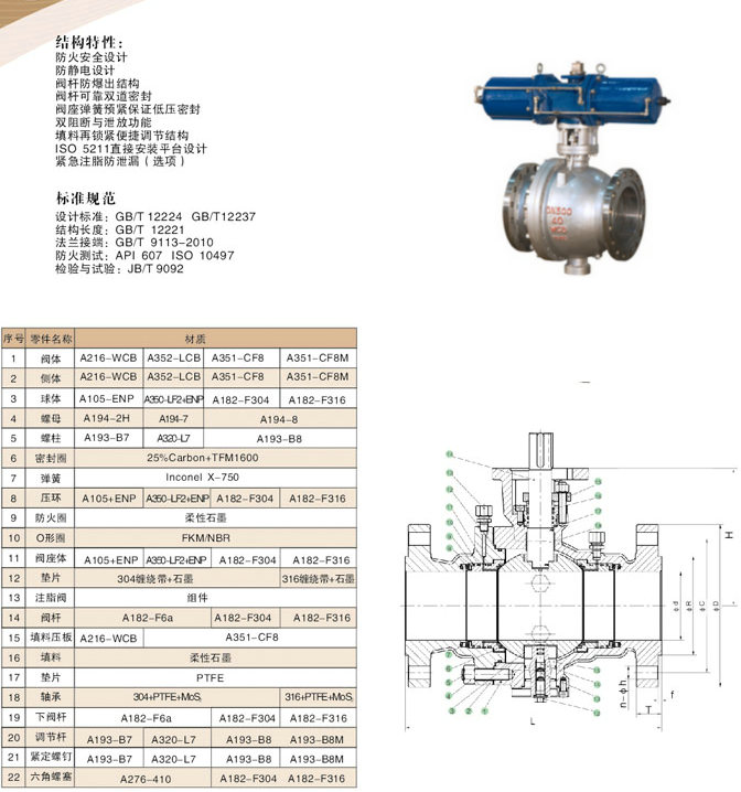 (3)防火結(jié)構(gòu):為防止由于驟熱或火災(zāi)的出現(xiàn),使聚四氟乙烯密封圈燒毀,發(fā)生大泄漏,而助長(zhǎng)火勢(shì),在球體與閥座間設(shè)置防火密封環(huán),在密封圈燒毀時(shí),在彈簧力作用下,將閥座密封環(huán)迅速推向球體上,形成金屬與金屬密封,起到一定程度的密封效果。耐火試驗(yàn)符合APl6FA和APl607標(biāo)準(zhǔn)要求。